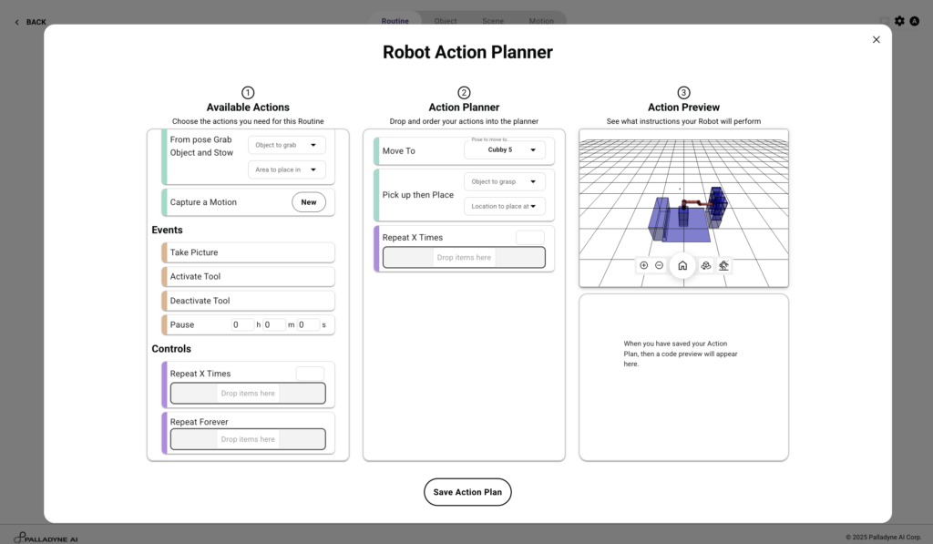 - Live overview of Palladyne IQ closed-loop autonomy, demonstrating robots perceiving environment changes in real-time, and making decisions like a human.