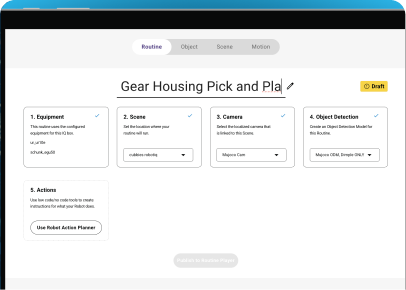 This is Routine Canvas, where users combine constructs to inform the Robot Action Planner. It serves as a central hub for connecting all the essential building blocks of a routine, such as scenes, cameras, object detection models, and more.