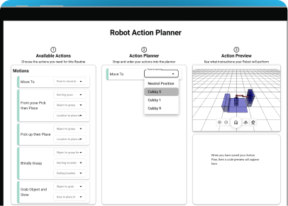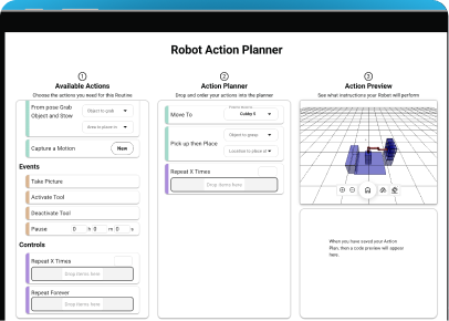 With the IQ Robot Action Planner, users can easily drag and drop actions into routines using structured action tiles.